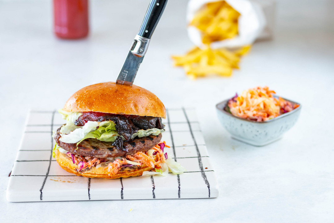 Rindsburger, Brioche-Bun, Kopfsalat, Tomate, Cheddarkäse und Cocktailsauce